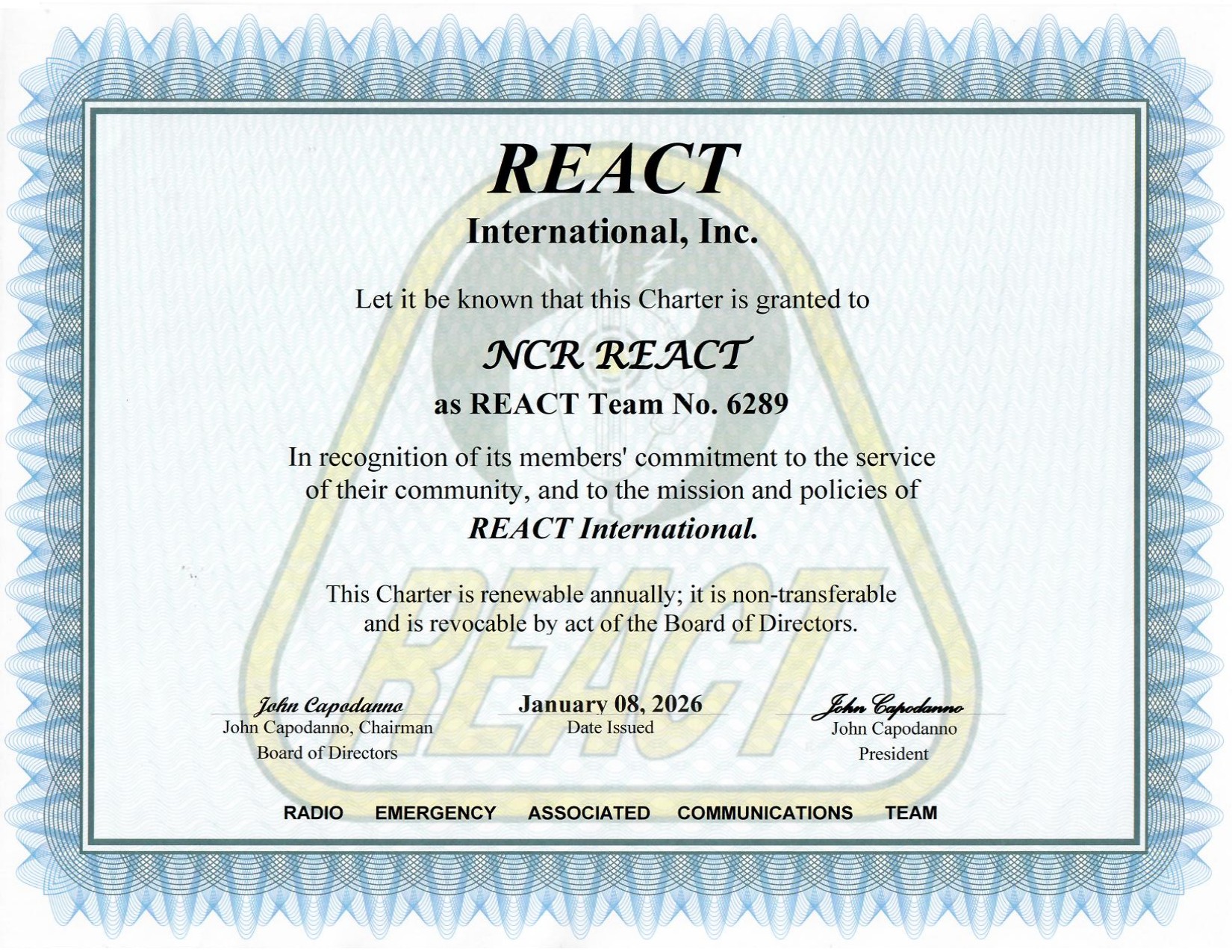 NCR REACTVarious Counties (DC/MD/VA)#6289 Chartered (View Certificate)